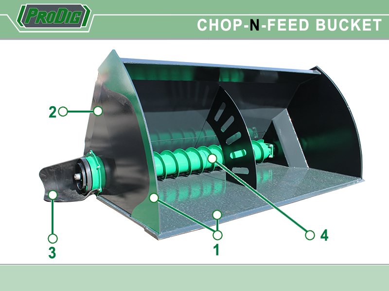 ProDig Beet Chopper and Meal Feeding Bucket is available in three sizes from 2m to 2.5m which will suit tractor loaders, telehandlers, articulated loaders & Tractor 3 Point Linkage. This versatile unit is equipped with a hydraulic motor which drives a heavy-duty auger for both chopping and feeding out so there is no need for a PTO drive. The large output on the bucket allows the bucket to unload and chop in a minimal amount of time • Auger mover is fitted on the rear of the bucket rather than the side to allow use in close proximity with walls. |